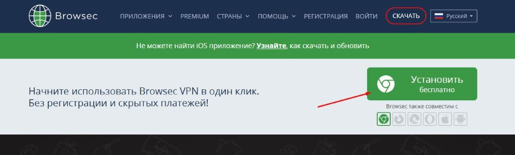На официальном сайте Browsec перейдите на страницу Google Chrome и кликните «Установить бесплатно».