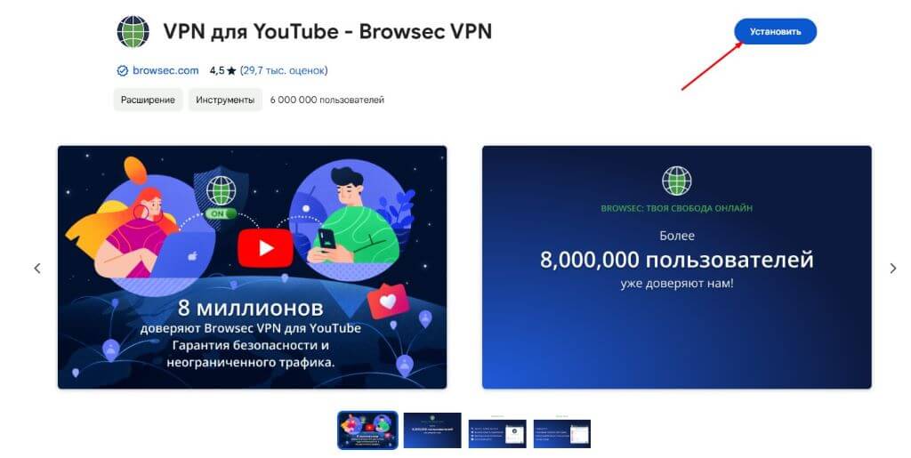 На официальном сайте Browsec перейдите на страницу Google Chrome и кликните «Установить бесплатно».